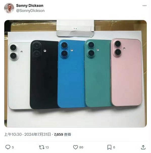 据海外知名爆料达人最新晒出的机模谍照,全新的 iPhone 16 标准版这次将提供五款配色,分别是白色、黑色、蓝色、绿色和粉色。