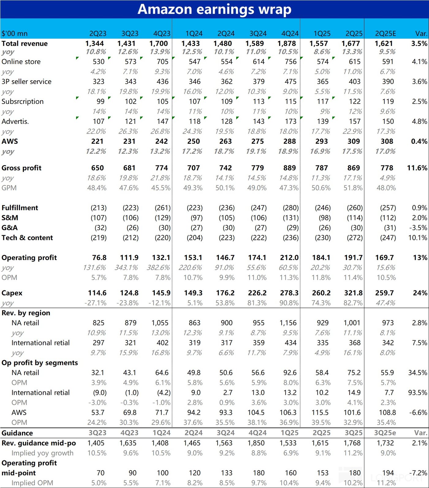 $亚马逊 (AMZN.US) 于北京时间 7 月 31 日早美股盘后,公布了 2025 年的 2 季度财报。然而亚马逊并未延续昨日微软和 Meta 的强劲势头,交付大超预期的业绩。