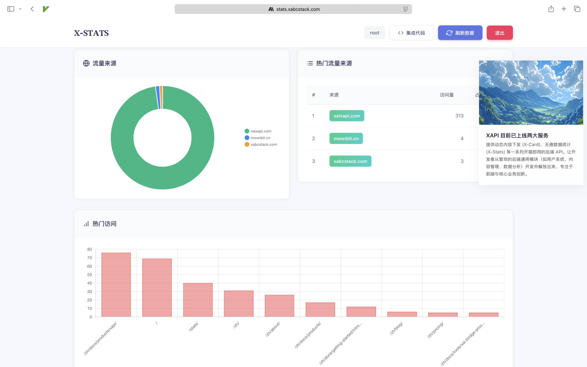• 数据看板:提供热门 URL 和热门来源排行榜,快速了解流量分布。