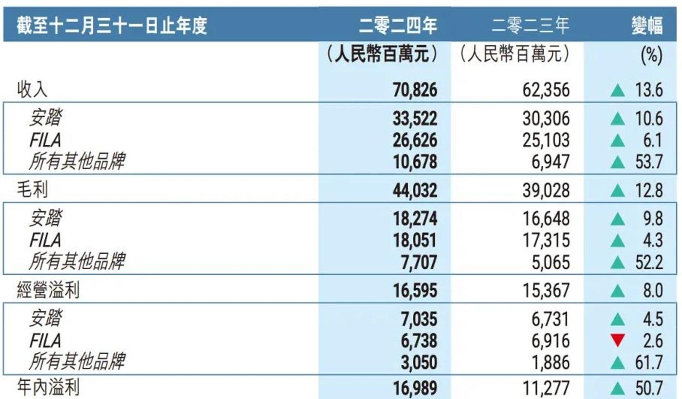 凭借买买买,安踏手中汇聚了国内目前最顶尖的品牌,营收也在 2024 年达到 708.26 亿元,同比上涨 13.6%;净利润 155.96 亿元,同比上涨 52.4%。