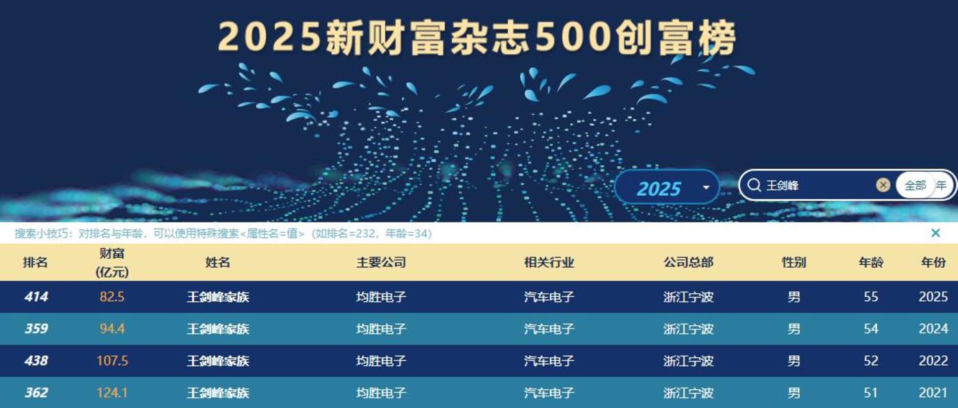 前不久,备受注目的 《2025 新财富杂志 500 创富榜》 发布,王剑峰家族以 82.5 亿元的财富,位列榜单第 414 位。