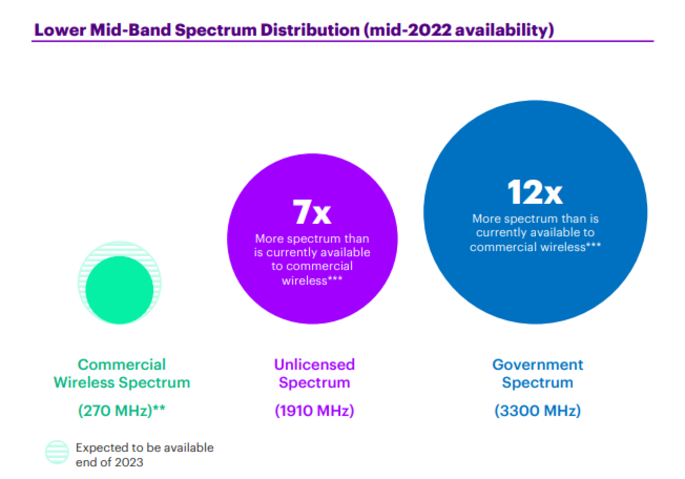 根据美国无线通信与互联网协会 (CTIA) 的统计,在 3GHz-8.4GHz 中低频段频谱中,移动通信行业的商用频谱仅占比约 5% ,免许可使用的频谱占比约 35%,而由美国联邦政府 (含军方) 控制的频谱占比高达 60%,是移动商用频谱的 12 倍;并且自从 FCC 的频谱拍卖权于 2023 年初到期后,移动通信行业就再没有获得任何新增频谱。