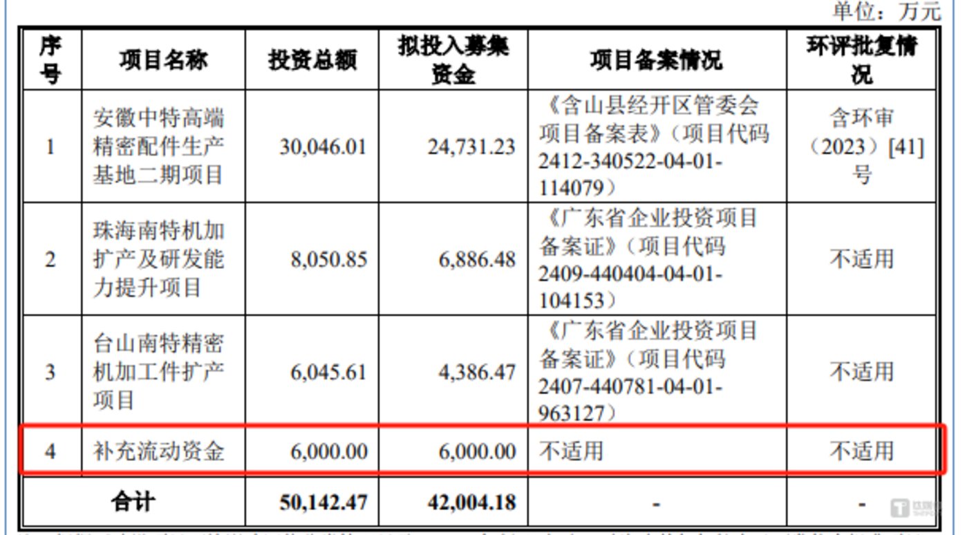 进一步分析发现,南特科技主要在上会稿中剔除了 「台山南特精密机加工件扩产项目」 及 「补充流动资金项目」,而对于剔除补充流动资金项目的合理性缺令人值得商榷。