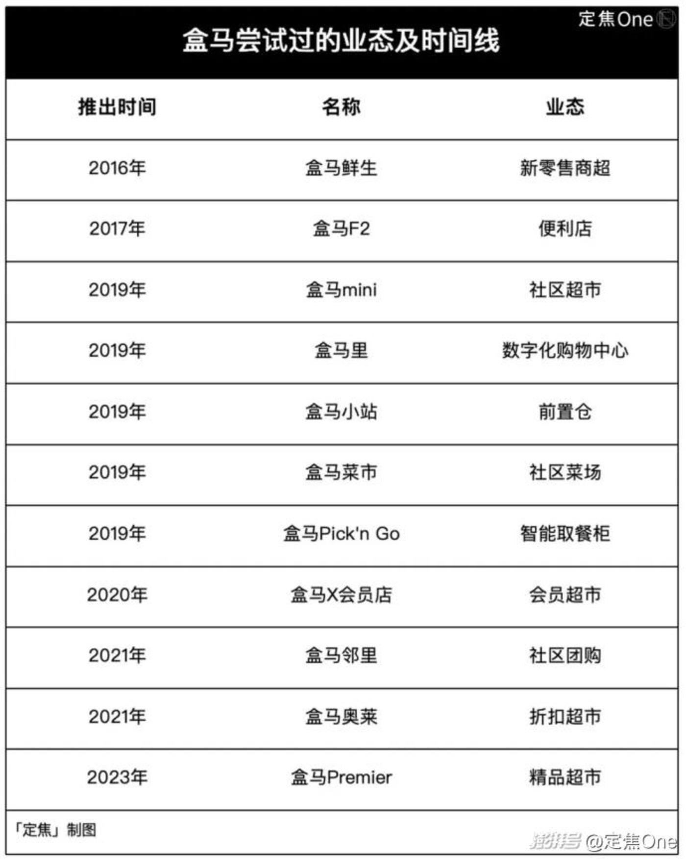 但 2019 年起,盒马进入摇摆期,先后尝试了十多种业态,包括定位新零售商超的盒马鲜生、便利店盒马 F2、社区超市盒马 MINI、数字化购物中心盒马里、前置仓盒马小站、社区菜市场盒马菜市、智能取餐柜盒马 Pick'n Go、会员超市盒马 X 会员店、邻里商业盒马 NB、折扣超市盒马奥莱。