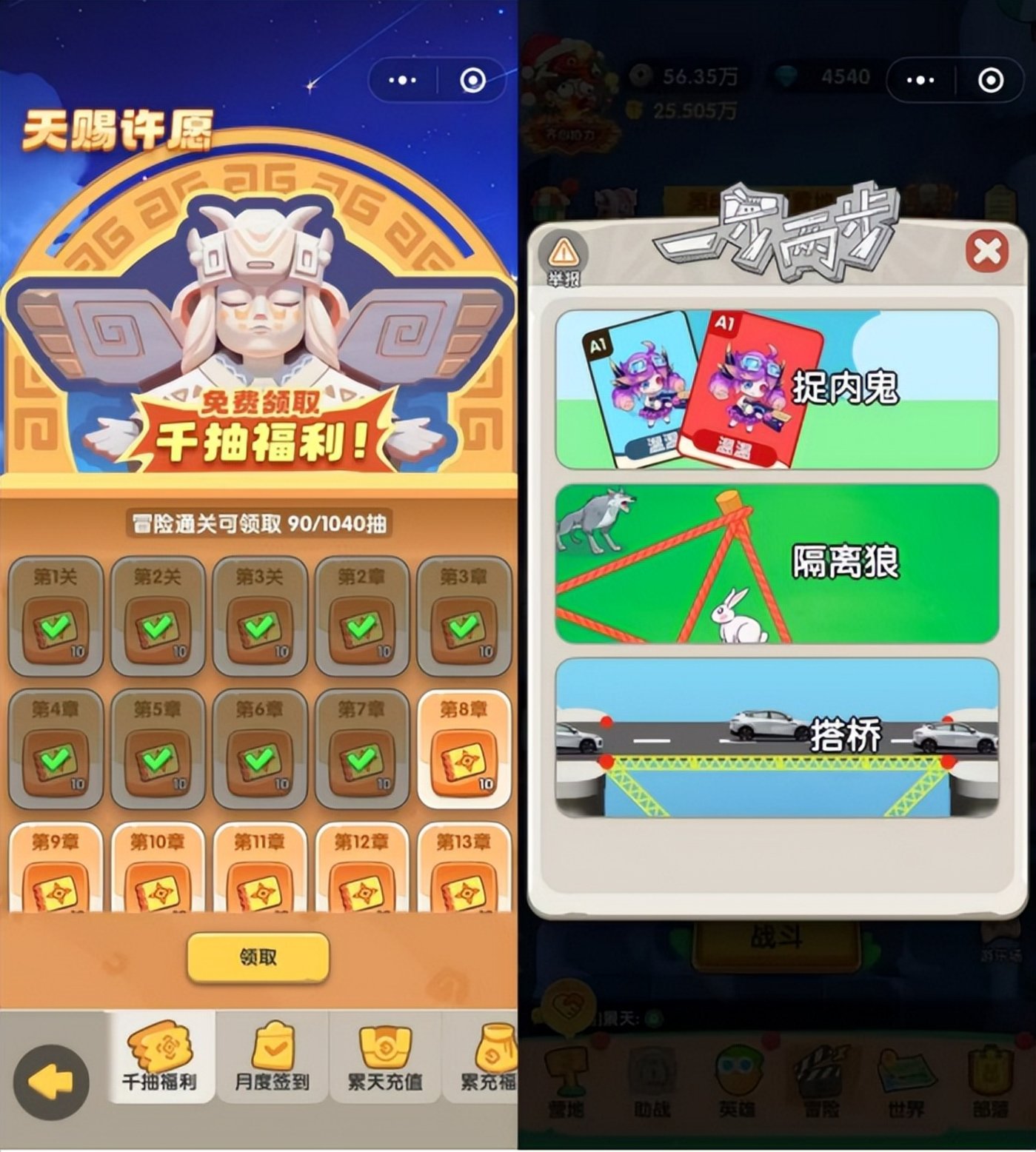 不过,《一步两步》 除了排行榜冲榜活动和各种战令礼包这些常见设计之外,还有不少小游戏特色的设计。例如 「千抽」 活动和 「游乐场」 玩法,千抽福利基本已经是放置类小游戏的标配,一般是每通过一定的主线关卡给予抽卡资源; 而 「游乐场」 则是各种魔性的副玩法,在买量时会具备优势。