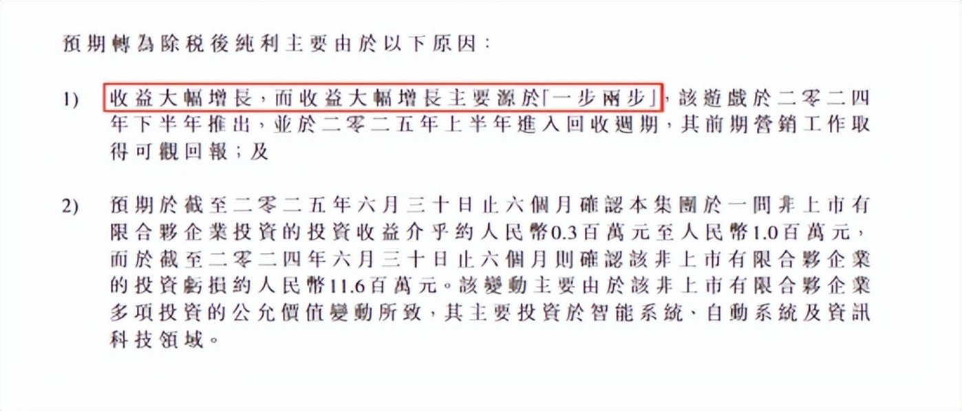 同样根据预告显示,公司扭亏为盈的主要原因是两点:一是主要源于游戏 《一步两步》 的收益大幅增长; 二是关于一间非上市有限合伙企业投资的投资收益介乎约 30 万元-100 万元。