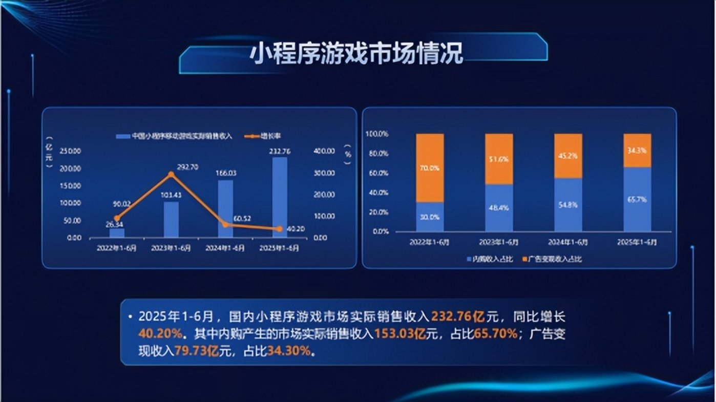 而小程序游戏市场则是中国游戏产业增长最快的市场,7 月 31 日游戏工委发布的 《2025 年 1-6 月中国游戏产业报告》 显示,2025 年 1-6 月,国内小程序游戏市场实际销售收入 232.76 亿元,同比增长 40.2%。经历了前两年的爆发式增长,小游戏仍处于较快增长的阶段。