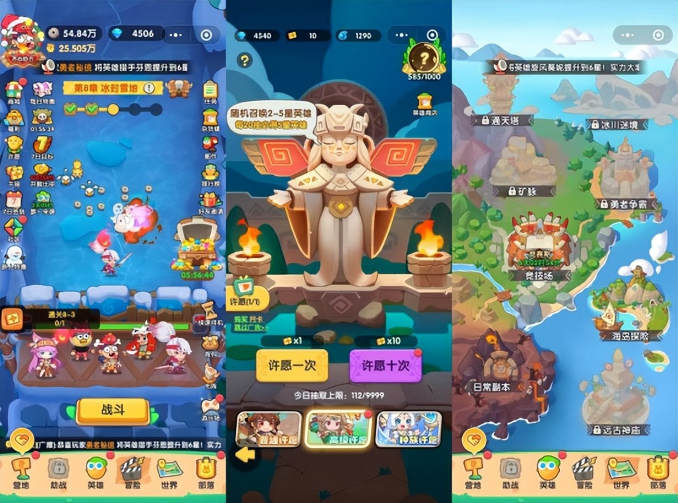 游戏的主线玩法为推关,并且随着关卡进度的推进挂机奖励也会提升。此外,也有竞技场、名为 「海岛探险」 的材料爬塔和日常副本等玩法,还有名为 「部落」 的公会系统。