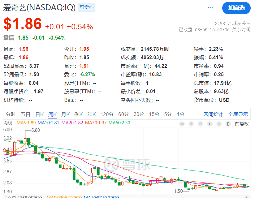 周三收盘,爱奇艺 (NASDAQ:IQ) 股价上涨 0.54% 至 1.86 美元,总市值约 17.91 亿美元。