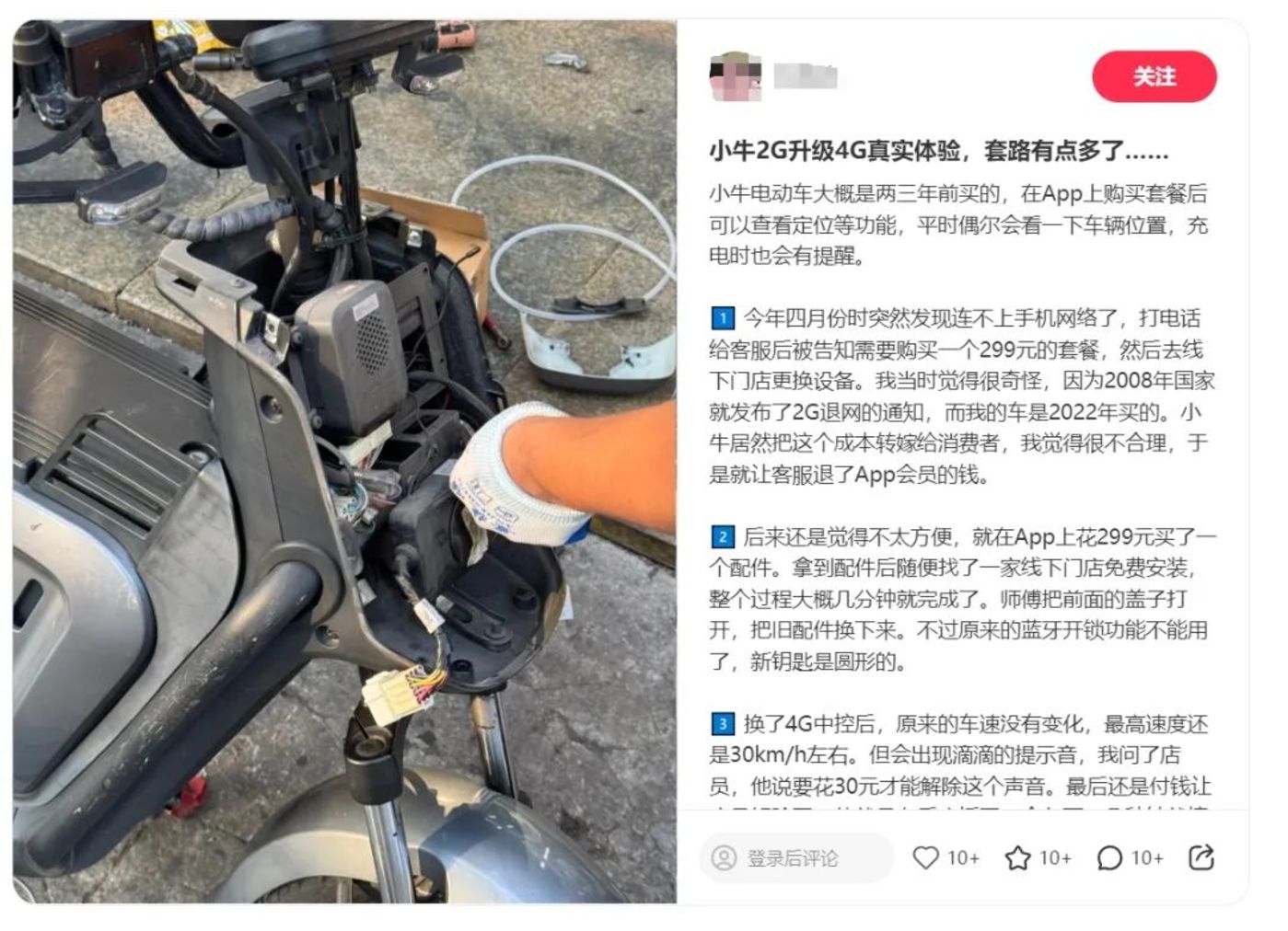 不少小牛用户发现,自己的电动车就出现了这种情况。由于一些小牛车型的中控仅支持 2G,出现了锐智 VIP 还在有效期,车辆的智能化功能却无法使用的情况。部分用户只能被迫自费 299 元升级 4G 才能恢复智能功能,而升级期间仍需要支付未中断的服务费。