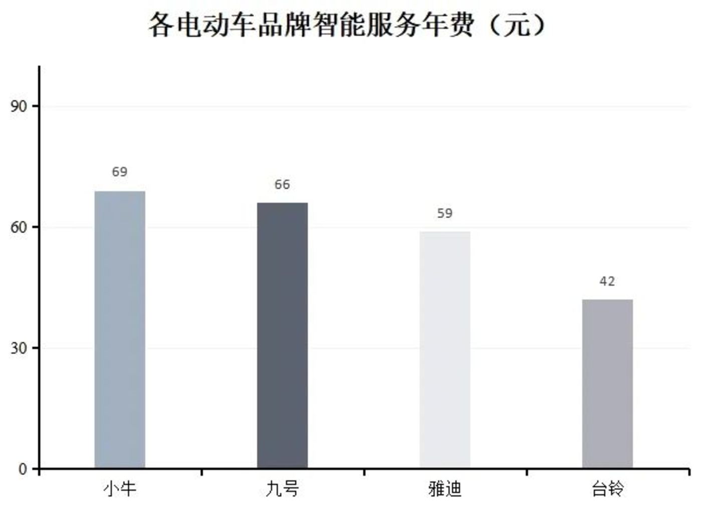 从价格上来看,在电动车品牌里,小牛的智能服务收费目前最高 (一年 69 元),其次是九号 66 元,有九号用户表示通过更换 4G 云盒、老带新等活动,智能服务费用有不同程度的减少;雅迪和台铃等品牌的智能费用分别在 59 元/年、42 元/年。