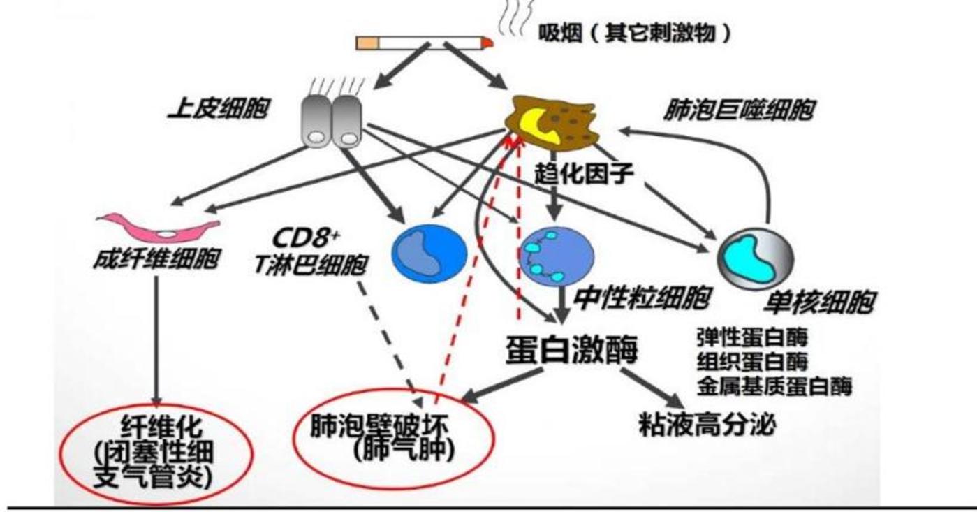 从医学定义看,COPD 是以持续气流受限为核心的肺部疾病,包含慢性支气管炎和肺气肿两种表型。其核心病理机制可概括为 「三重打击」:一是慢性炎症导致气道黏液高分泌,阻塞气道;二是蛋白酶失衡破坏肺泡弹性纤维,造成肺泡破坏 (肺气肿),气体交换受损;三是反复炎症触发气道壁纤维化和平滑肌增生,导致气道不可逆狭窄。三者叠加,导致患者呼吸困难渐进加重,从活动后气短,发展至静息时亦无法顺畅呼吸。