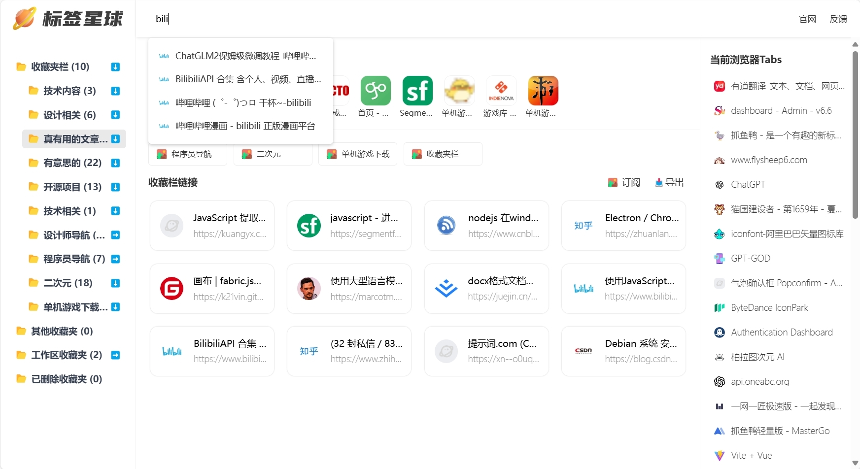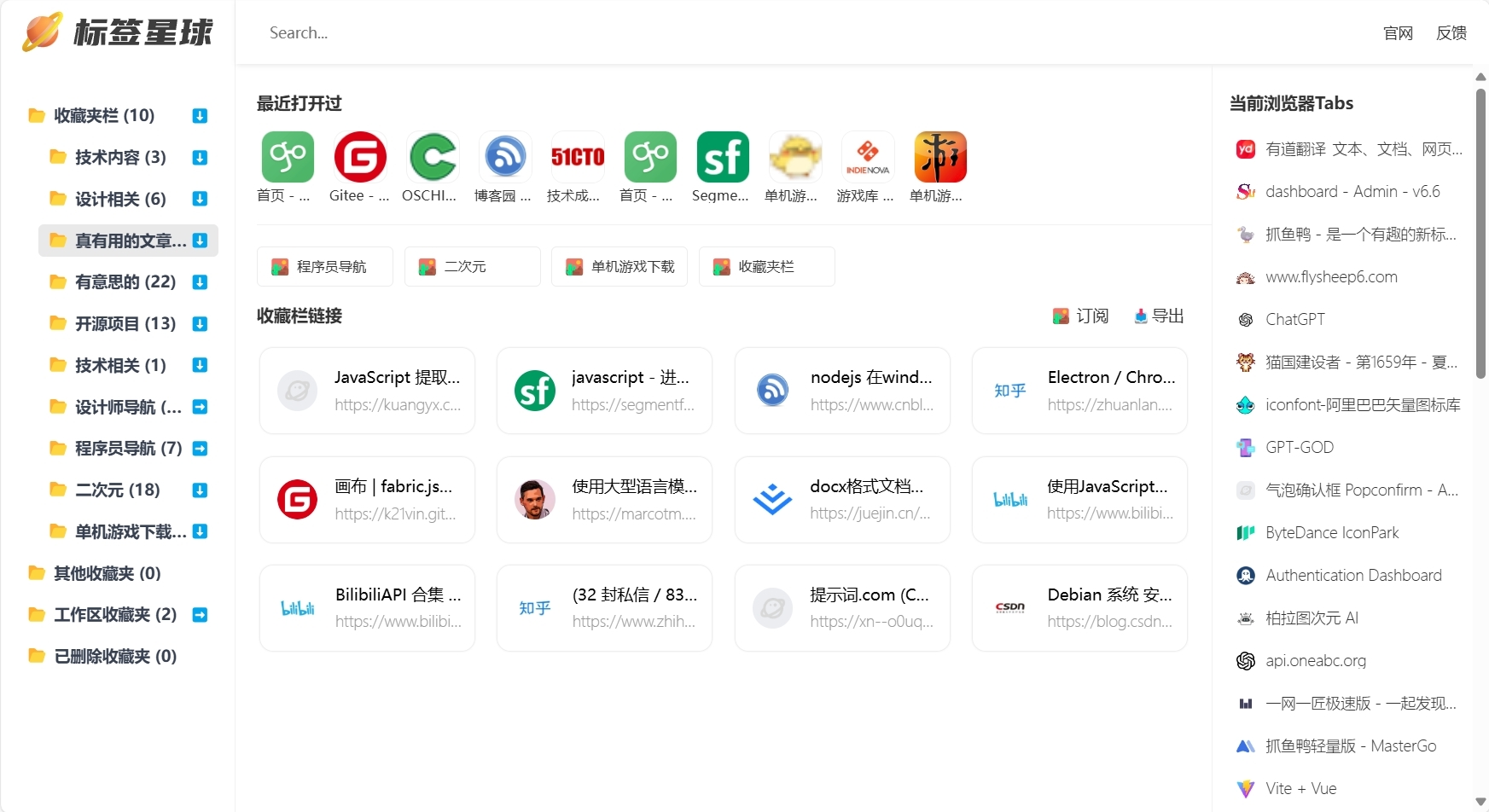 标签星球是一个基于浏览器的收藏夹管理工具,你可以轻松的管理你的收藏夹、Tabs 书签、书签分类、搜索记录、订阅源等数据,让你的浏览器成为一个仪表盘。