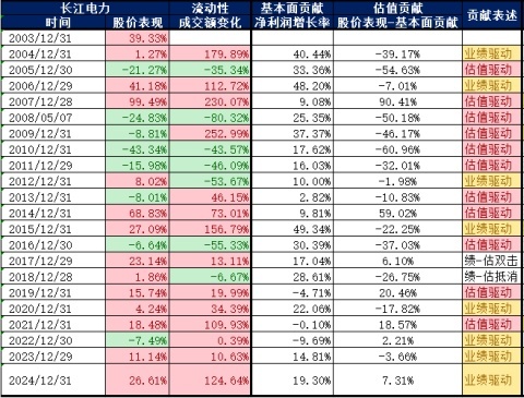 长江电力剔除上市第一年和今年,中间有 21 个年头,估值驱动占 11 个年头,业绩驱动占了 8 个年头,相抵和双击各占 1 个年头。
