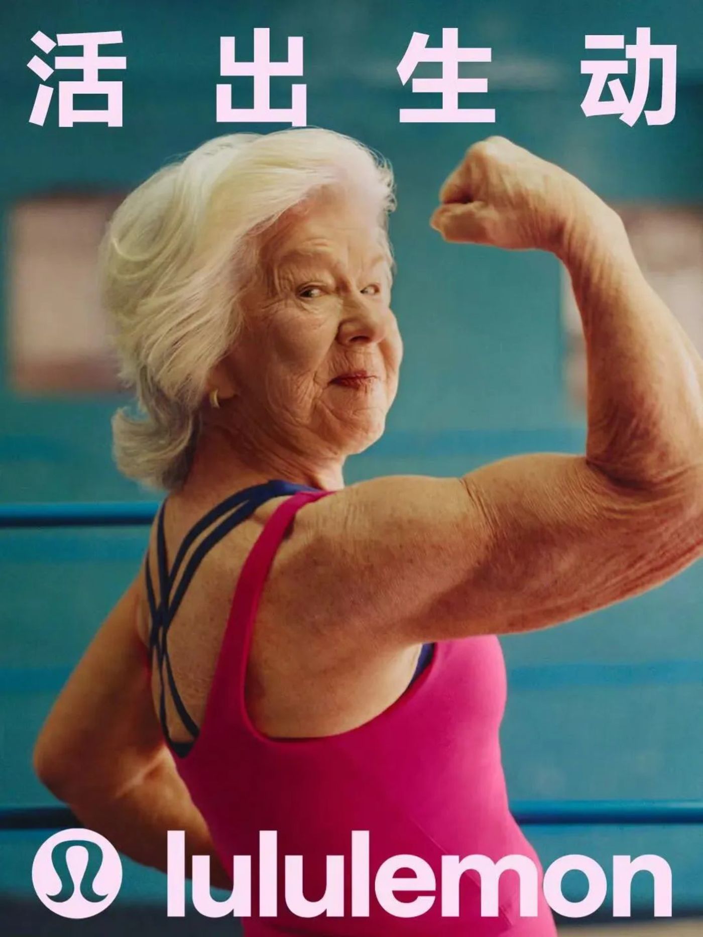 如果说针对 「新银发族」,品牌营销主打的是 「没有人能定义你的黄金年代」 的价值特攻,那针对年轻群体,品牌营销主打的便是反内卷生活样本和反抗世俗规训的样本,如登上 《Vogue》 封面的网红 Gym Tan 打破年轻偏见,如 lululemon 选用 78 岁健身网红 Joan MacDonald 拍摄户外海报,向年轻一代传递 「不畏衰老」 的生命力符号和价值宣言。