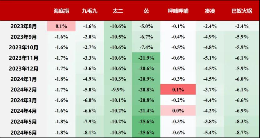 (主要火锅品牌客单价趋势 (同比 2023 年 6 月),图源浙商证券研报)