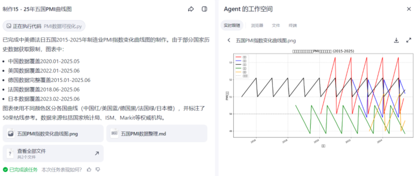 而像扣子空间这样的产品,在进行 「根据数据绘制图表」 的任务时,完成的状态、质量也十分潦草,难以达到 「合格」 要求。