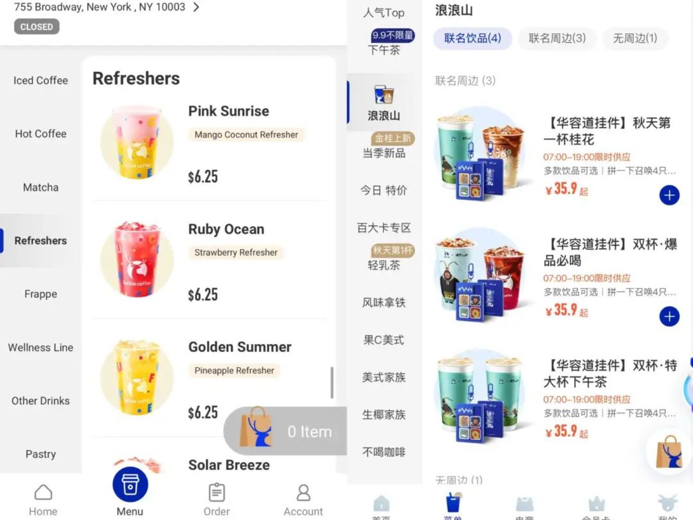 同时打开中美两个版本的点单页面,不难发现瑞幸在产品上做出了一定的本地化调整。在中国市场频繁出现的联名限定消失了,取而代之的是根据美国消费者口味喜好定制的饮品:比如 「黄金夏日」(菠萝冰萃) 和 「粉红日出」(果味特调) 等,同时也加入了美国人日常喝的滴滤咖啡。