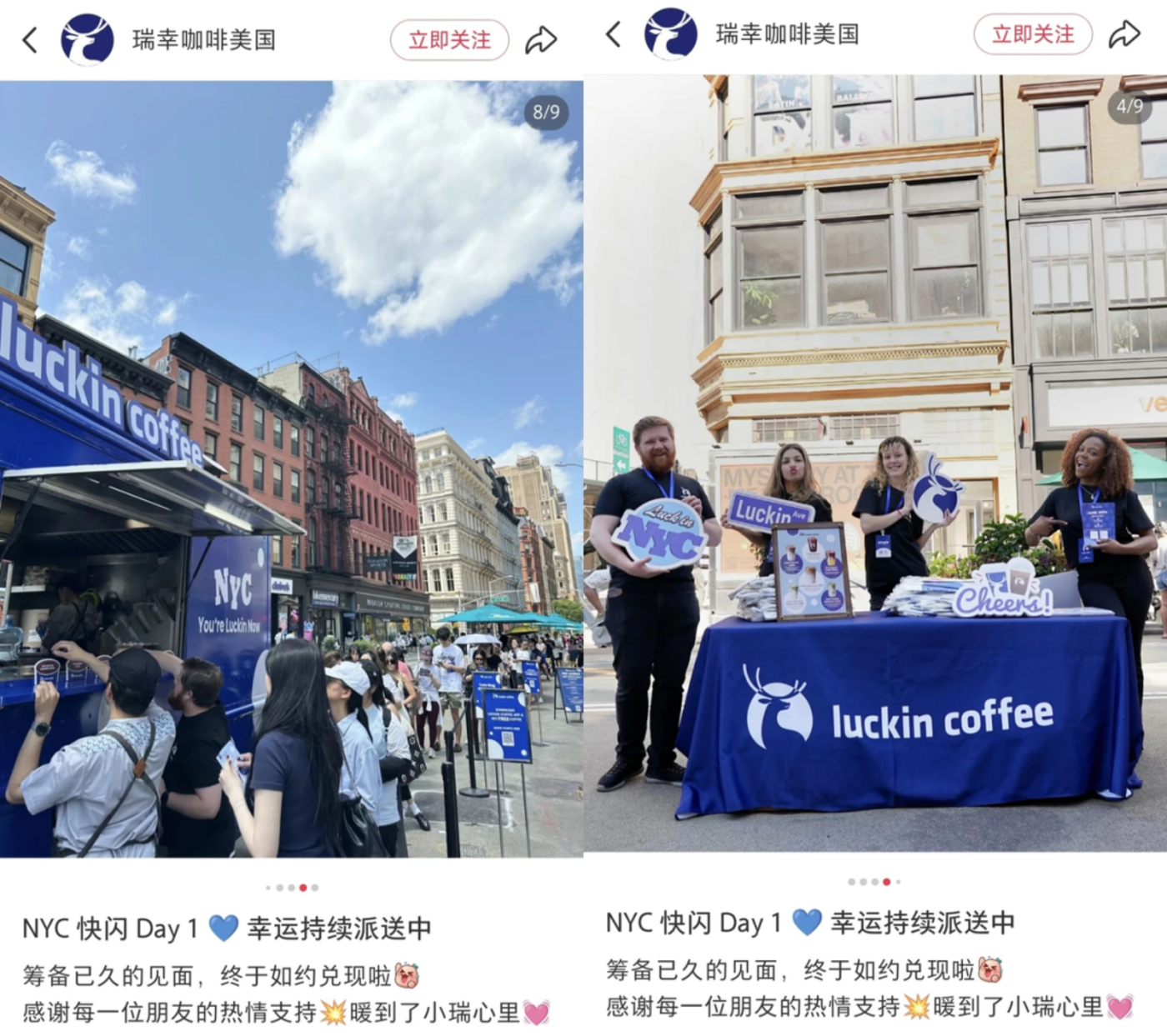 早在正式开店前十天,瑞幸就已经在纽约街头试水。从 6 月 20 日到 24 日,他们连续在联合广场、SoHo、麦迪逊广场和先驱广场办了四场快闪活动。每一站都选在纽约最热闹的地段:人流密集、社交氛围浓厚,是潮人、白领和游客扎堆出现的地标性区域 [3]。