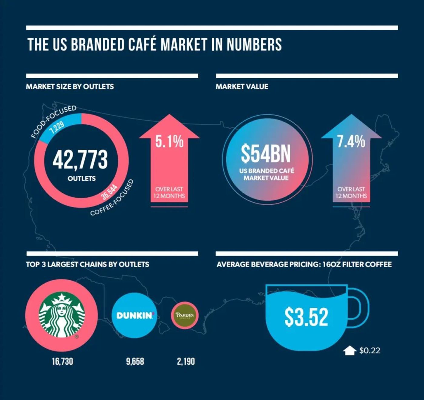 作为全球最大的咖啡消费国之一,美国共有超过 500 个咖啡连锁品牌,经营门店数量超过 42700 家,市场规模达 540 亿美元。仅星巴克一家就在美国拥有超过 16000 家门店,占据了本土咖啡市场近 40% 的份额;另一售卖咖啡产品的快餐品牌 Dunkin』 Donuts(唐恩都乐) 也拥有近 1 万家门店。可以说,美国咖啡市场已经趋向饱和 [1]。