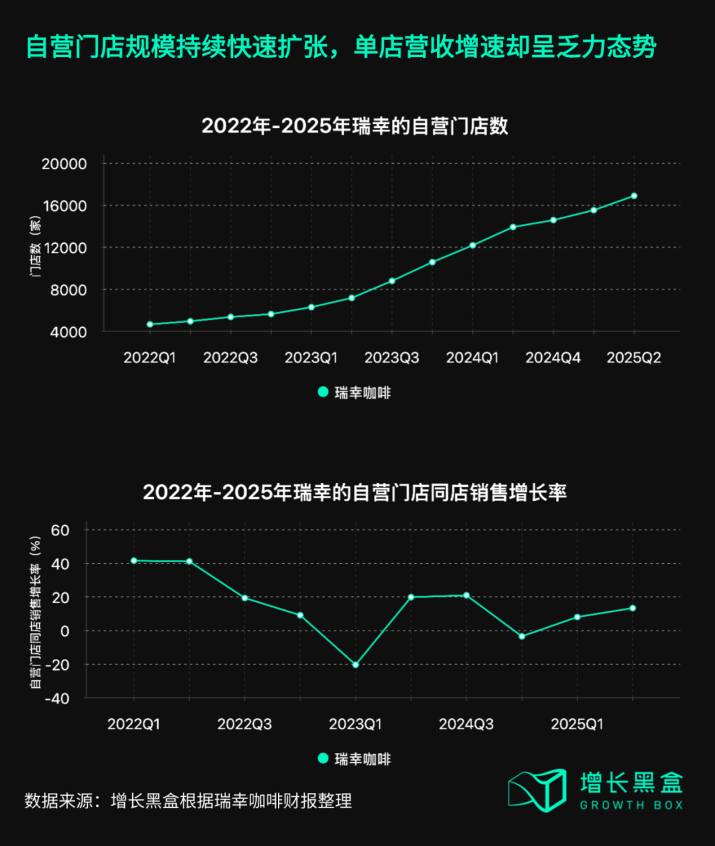 2025 年 Q1,瑞幸的自营门店同店销售增长率由负转正,虽然略有回升至 8.1%,但相较 2022 年 41.6%、2023 年 19.9% 的高增长,已明显失速。