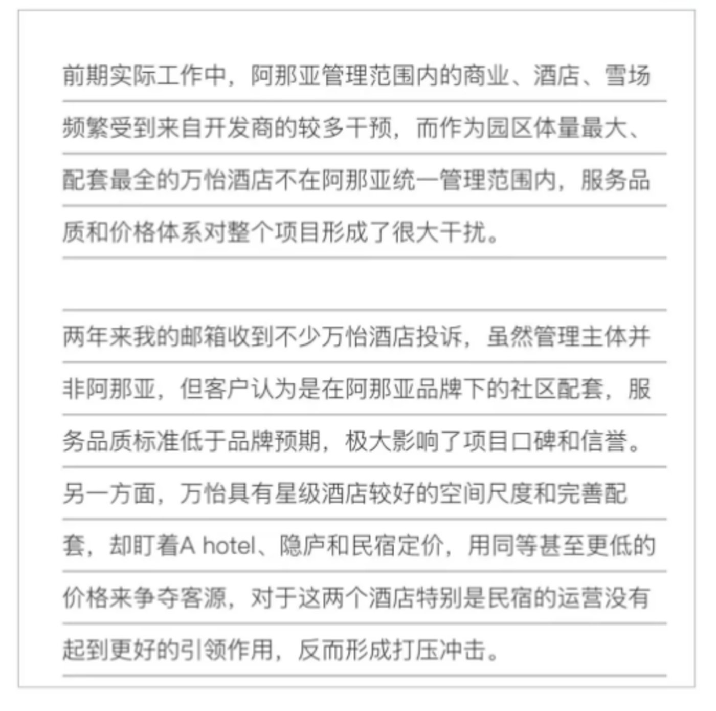 而实现高品质运营管理目标的前提是必须进行统一整体运营,对项目价格体系、服务品质、客户满意度进行全盘管控。可前期实际工作中,阿那亚管理范围内的商业、酒店、雪场频繁受到来自开发商的较多干预。