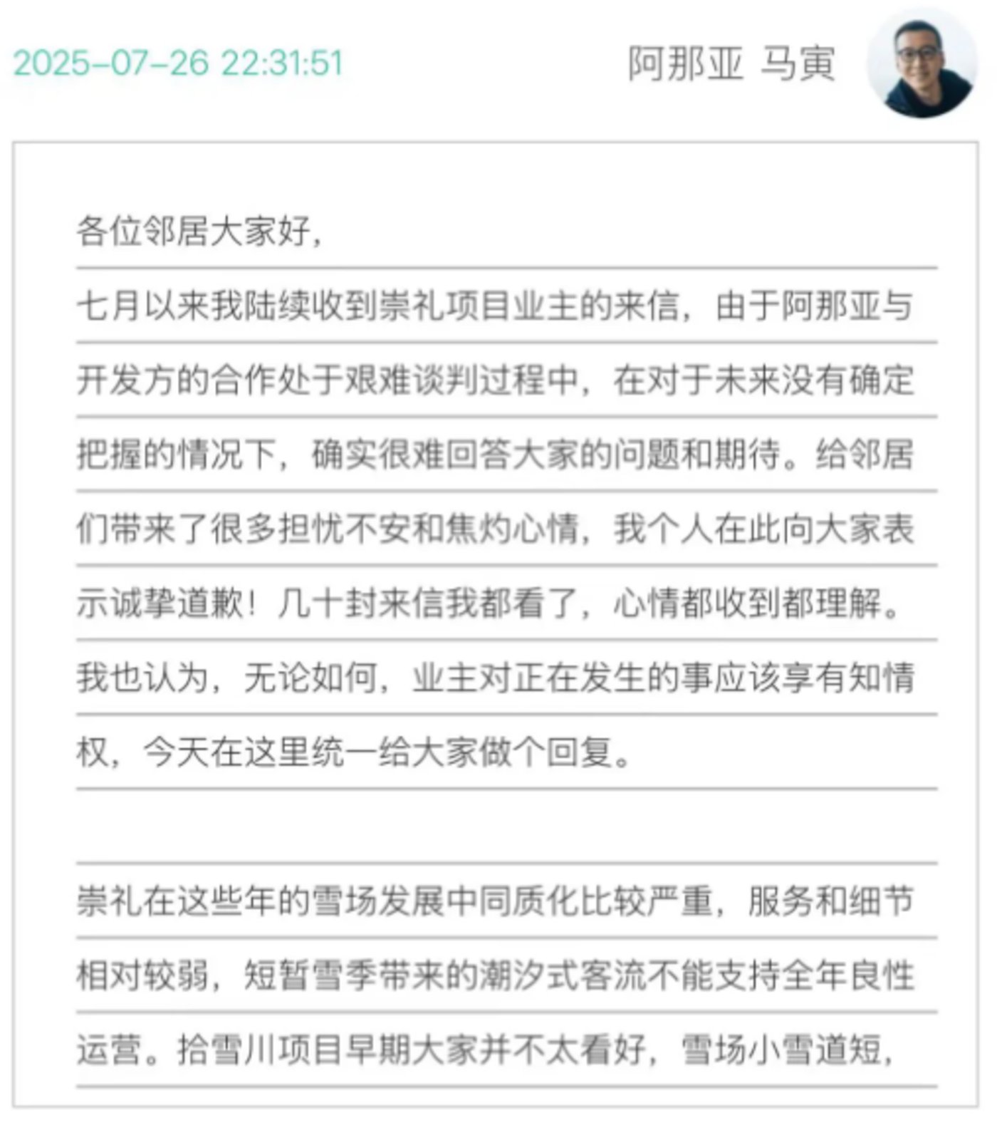 这与马寅回复信里所说的时间节点也对应上了。一直到 9 月中旬前,已经买了阿那亚崇礼房子的业主们,也只能日渐焦虑,盼望阿那亚能留下,不要等来一个三输结局。