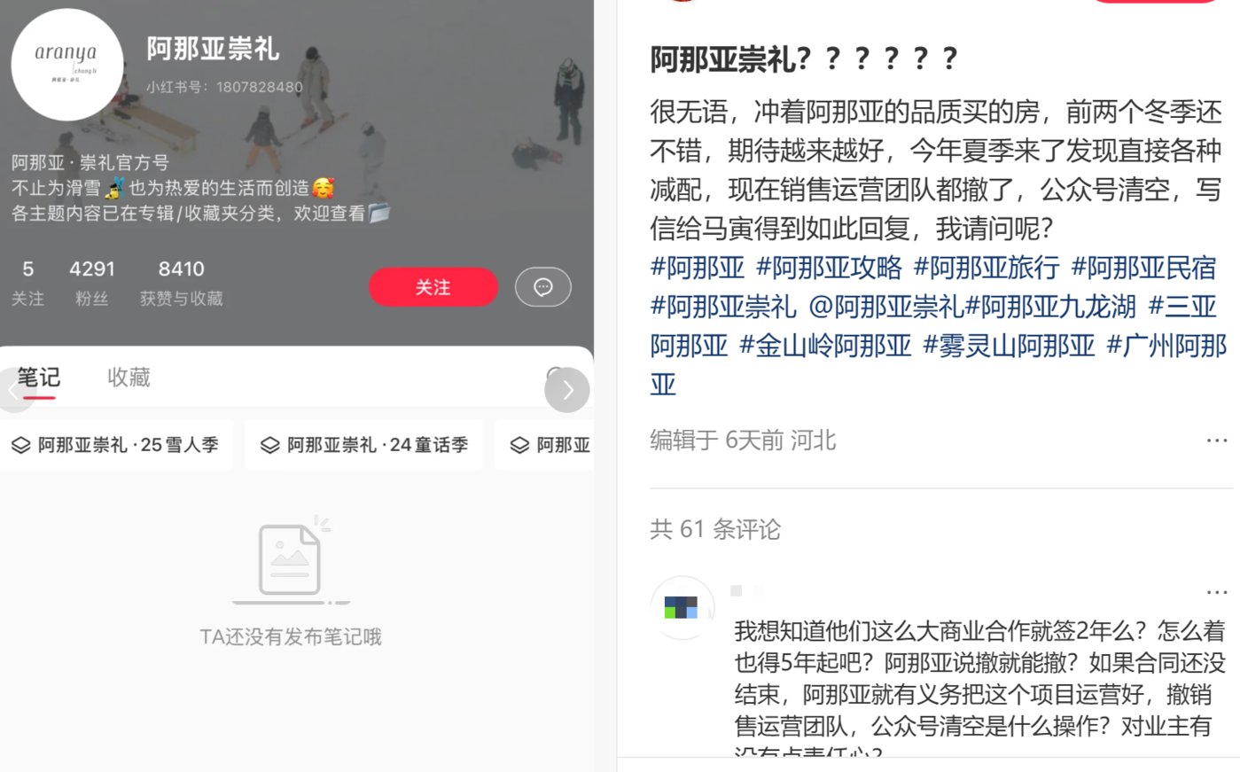 而且从现有信号看,双方谈判情况并不乐观,已经有业主发现,小红书上 @阿那亚崇礼官方账号发布内容已经清除,而阿那亚官方微信公众号有关崇礼项目的介绍文章也已被发布者删除。