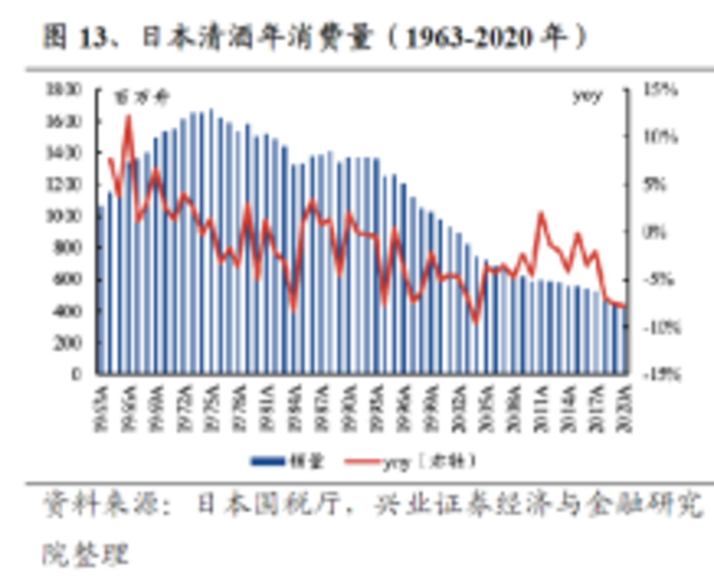 日本清酒在 1973 年达到 14 亿升后,开始下滑,2020 年仅剩 4 亿升,品类连续 40 年下滑。目前产量不到巅峰时期的三分之一。在酒类市场的占比,从巅峰时期的 90%,下降到不足 5%。