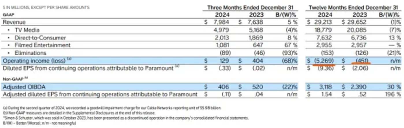 先说个数字:2023 年,派拉蒙全球 (Paramount Global) 全年营业亏损 (Operating loss) 超过 4.5 亿美元;2024 年营业亏损更是跳涨到 53 亿美元。