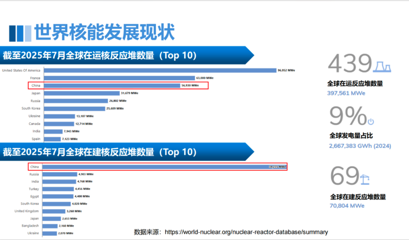 从当前全球空间来看,有439 台运行核电机组,占总发电量 9%,在建 69 台。美国以约 100 台运行机组居首,中国则有 30 多台在建机组领先全球。