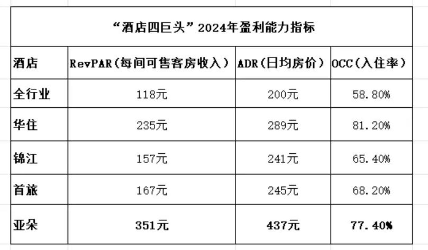 根据酒店之家数据,2024 年全行业的 ADR(日均房价) 为 200 元。而四大酒店的日均房价分别为:亚朵为 437 元、首旅为 245 元、华住为 289 元、锦江为 241 元。