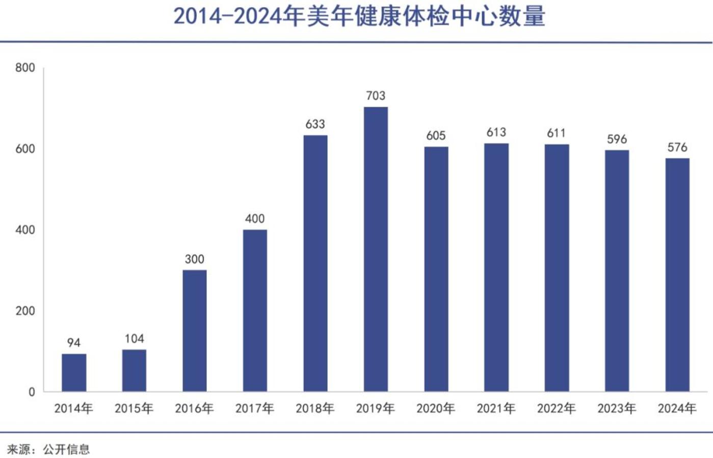 比如,2014 年美年健康的体检中心数量为 94 家,而到了 2019 年,其已在 294 个核心城市布局 703 家体检中心。