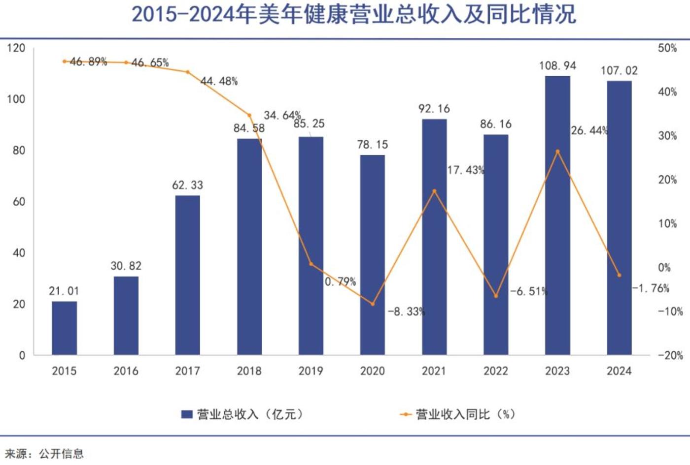 从 2019 年开始,美年健康就告别了业绩的高增长。2024 年,美年健康实现营业收入 107.02 亿元,同比微降 1.76%;归母净利润 2.82 亿元,同比大幅下滑 44.18%。净利润率仅为 2.64%,较 2023 年的 4.64% 进一步收缩。