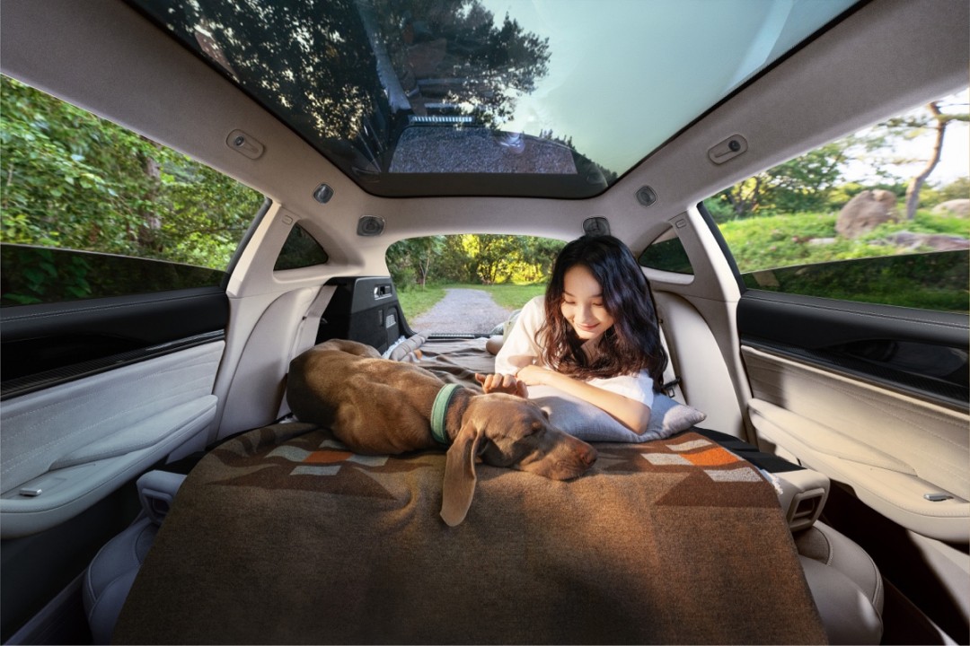 内饰方面,车内大量使用仿麂皮包裹,搭配精致缝线,车顶还配备了一块超大全景隔热天幕。此外,新车的后排座椅可以完全放倒,储物空间可拓展至 1295L,同时还可以形成一张 「大床」,方便露营时在车内休息。