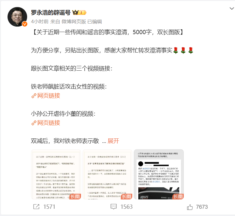罗永浩今日通过微博 「罗永浩的辟谣号」 发布五千字长文,对近期的部分谣言和传闻作事实澄清。在此之前,一位自称是俞敏洪 20 多年的好友 「张翔」,突然发文曝光了罗永浩的五宗罪。