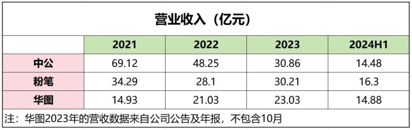 数据显示,2024 年上半年,粉笔实现收入 16.3 亿元,同比减少 3.1%;净利润为 2.78 亿元,同比增长 240.88%;华图教育则实现营收 14.88 亿元,归母净利润为 1.28 亿元,同期,中公教育实现营收 14.48 亿元,同比下滑 16.23%;对应归母净利润 1.16 亿元,同比增长 41.38%。