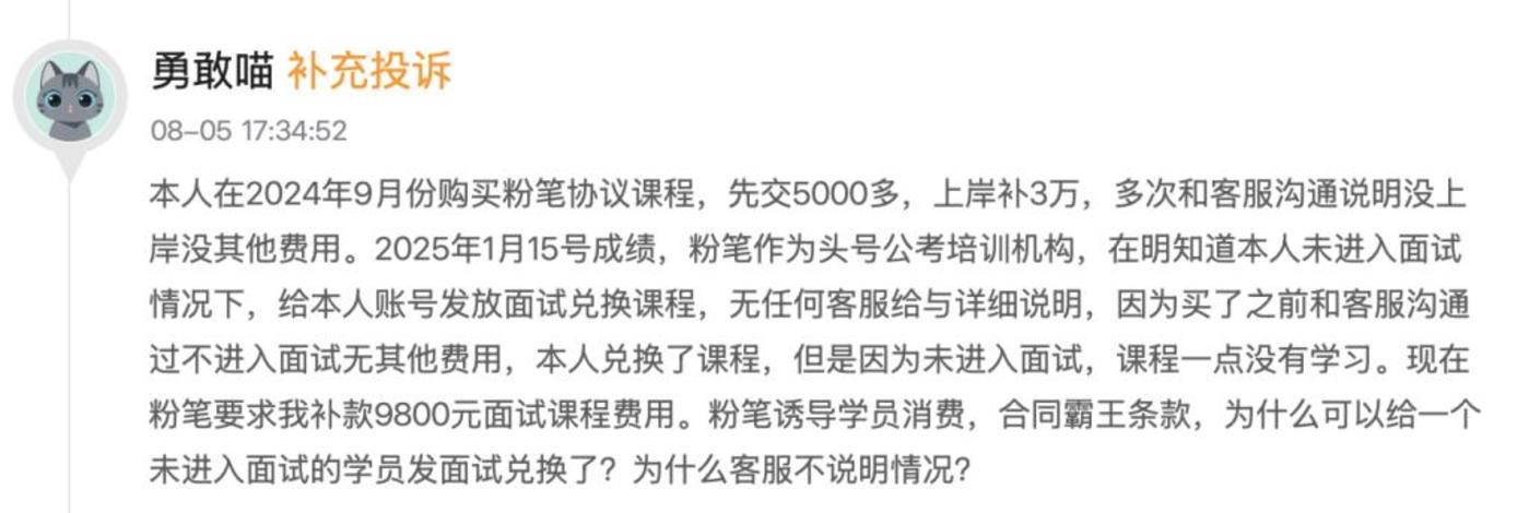 但是无论是因为基于教学品质而主动放弃县市域市场,还是因为加盟模式和现金流压力而被迫放弃下沉市场,在黑猫投诉等平台上,有关粉笔退费难等问题的投诉已然多达上千条。如果说是因为教学品质放弃县市域市场,但其教学质量的提升却似乎有限。