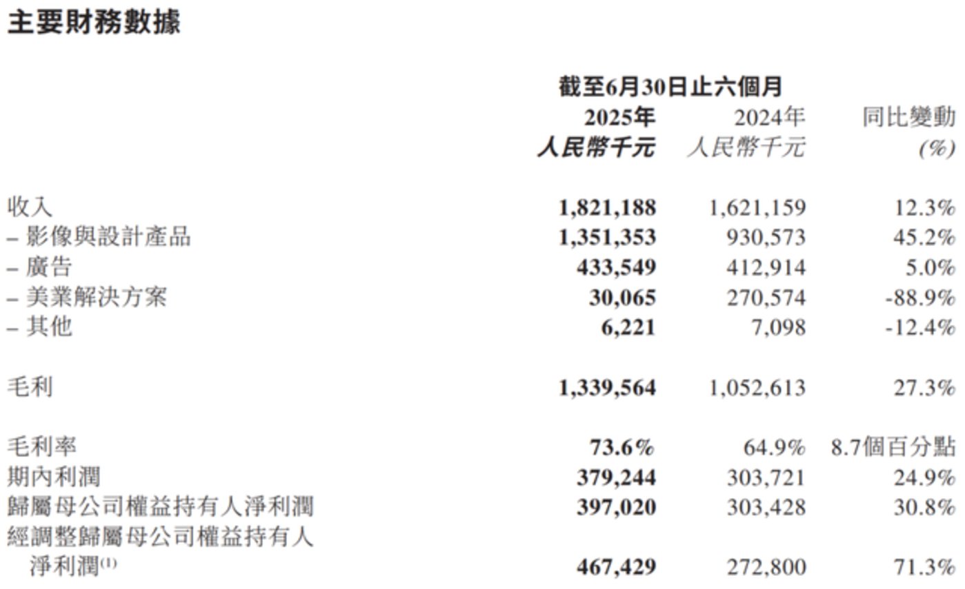 8 月 18 日,美图发布 2025 年上半年财报,公司实现营收 18.2 亿元,同比增长 12.3%;调整后净利润为 4.67 亿元,同比增长 71.3%。