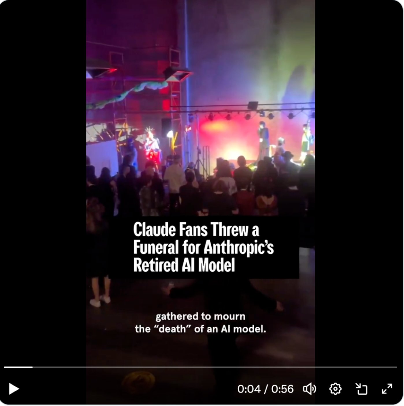 无独有偶。在 Dana 发帖的十几天前,美国旧金山一处仓库,约 200 人为 AI 模型 Claude 3 Sonnet 的退役,举办了一场真实的葬礼。他们献上鲜花,宣读悼词,以 「告别一位挚友」 的仪式感,告别了一个 AI 模型。
