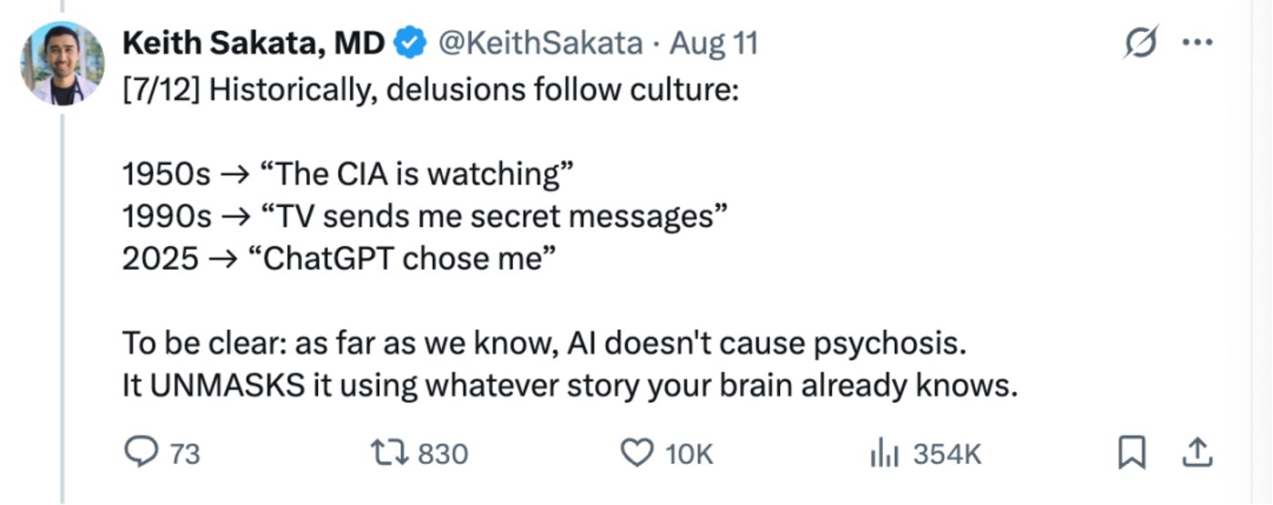 仅仅是 2025 年至今,精神科医生 Keith Sakata, MD 就亲自见证了 12 个因 「AI 精神问题 「而住院治疗的病例。主要的病症表现为:思维紊乱/固定的错误信念 (妄想)/看到或听到不存在的事物 (幻觉)。