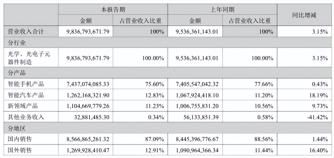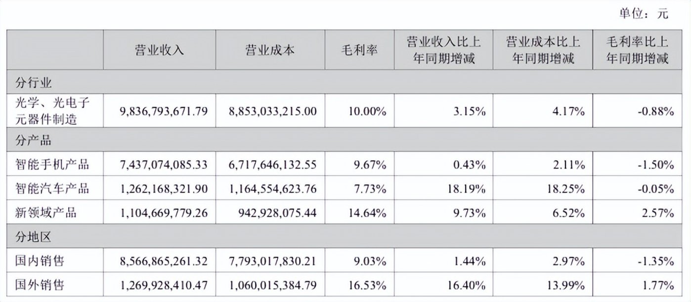 上述三项主力业务同比均获得了不同程度的增长,其中智能手机增幅最小,仅录得 0.43% 的同比增长;智能汽车同比增幅最大,达到 18.19%,这也被公司视为 「新增长引擎」。
