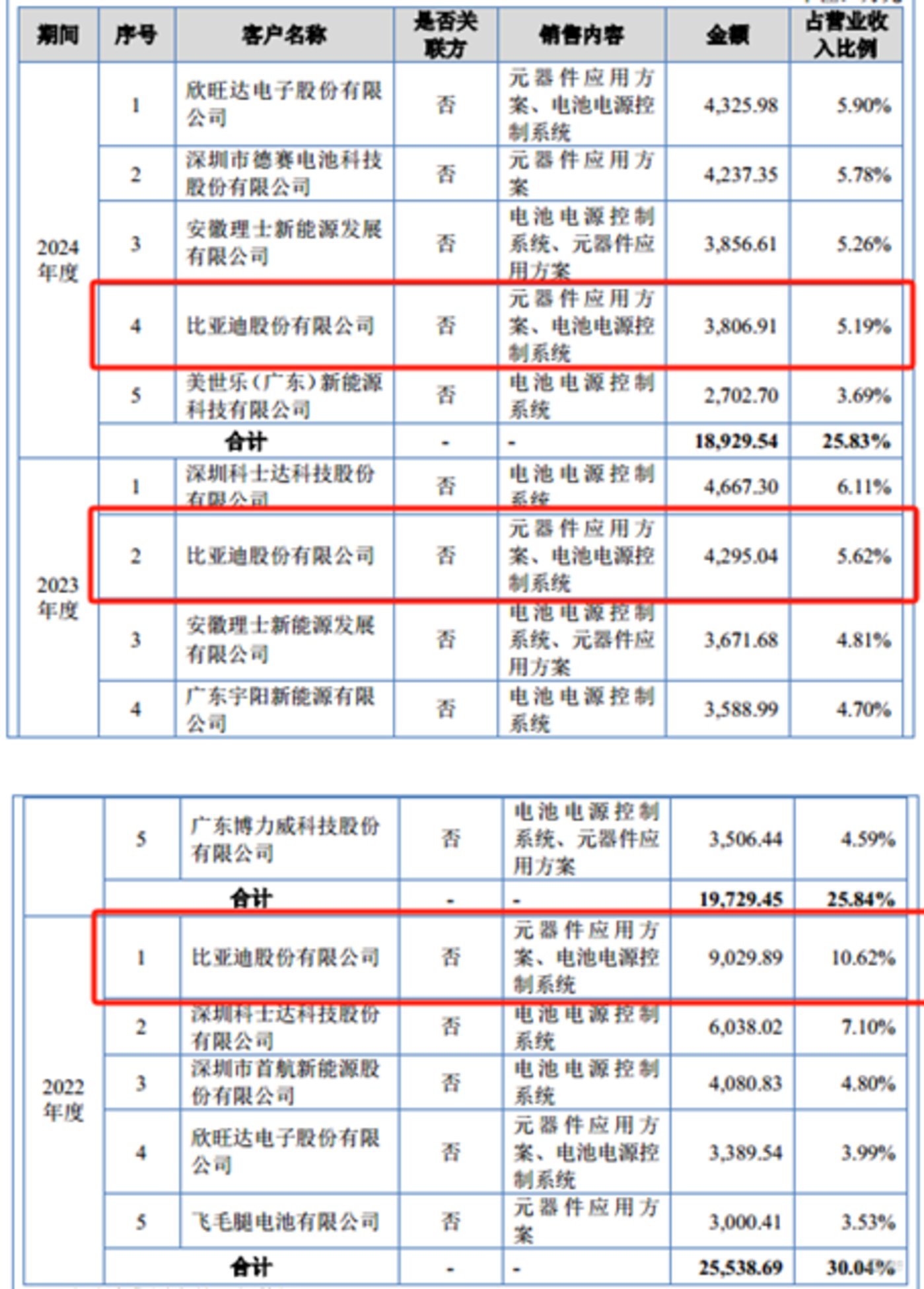 值得关注的是,沛城科技的业绩下滑似乎还伴随着来自重要客户比亚迪的订单收缩。报告期内,公司对比亚迪的销售收入持续走低,分别为 9029.89 万元、4295.04 万元、3806.91 万元,呈现逐年递减态势。与此同时,比亚迪在沛城科技客户名单中的排名也从 2022 年的第一大客户滑落至 2024 年的第三大客户。