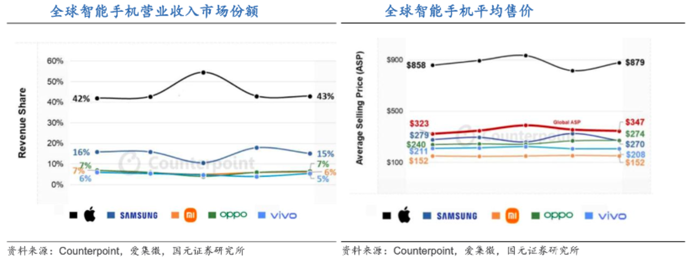 根据 Counterpoint Research 数据,小米手机全球出货量占比高达 14%,仅次于三星的 20%,苹果的 17%,如果以营业收入为口径,却仅有 6%,反观 OPPO,其全球 ASP 要比小米高 120 美元,营收占市场份额还要高于小米。