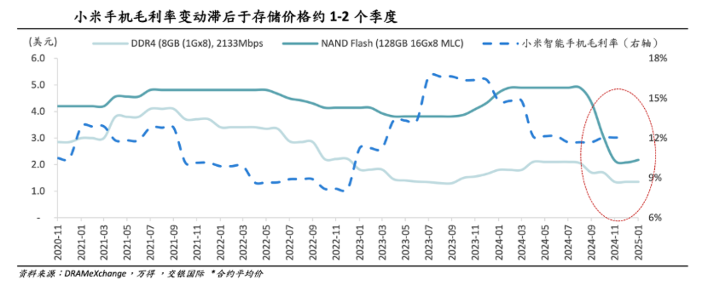 厂商押注 AI 手机固然多了卖点和噱头,但另一方面大模型手机亦会提高存储需求,手机的存储参数随成本开始飙升,在此背景下小米手机毛利率越发开始锚定存储价格。