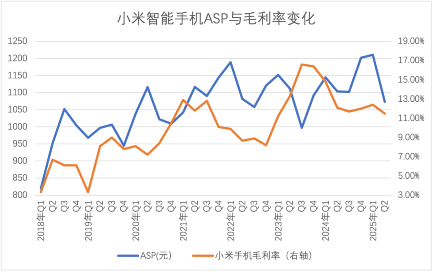 2025 年 Q2,小米手机毛利率和 ASP 呈现双双下行,尤其后者更是创了近年内新低,市场中开始弥漫着小米高端化受阻的声音。