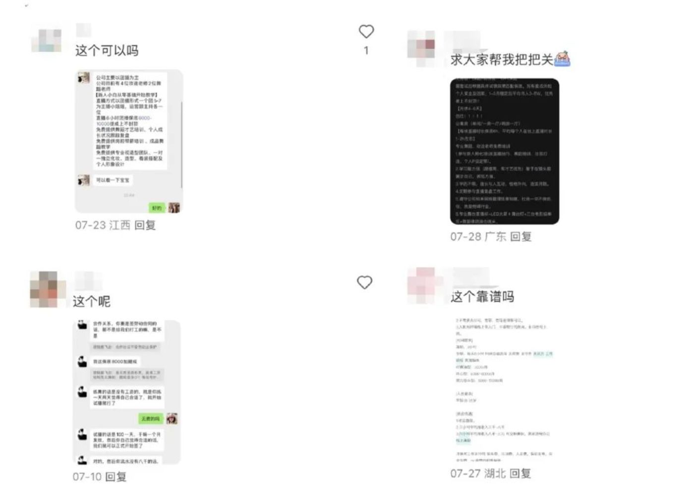 至少在眼下,一些有过团播经历的人,已经开始在社媒平台劝人不要轻易尝试,但在远高于平均工资的薪酬诱惑下,更多人还是抱着试一试的心态,在这类帖子下拿着跟 hr 的聊天记录询问:「博主看下我这个可以 (相信) 吗?」