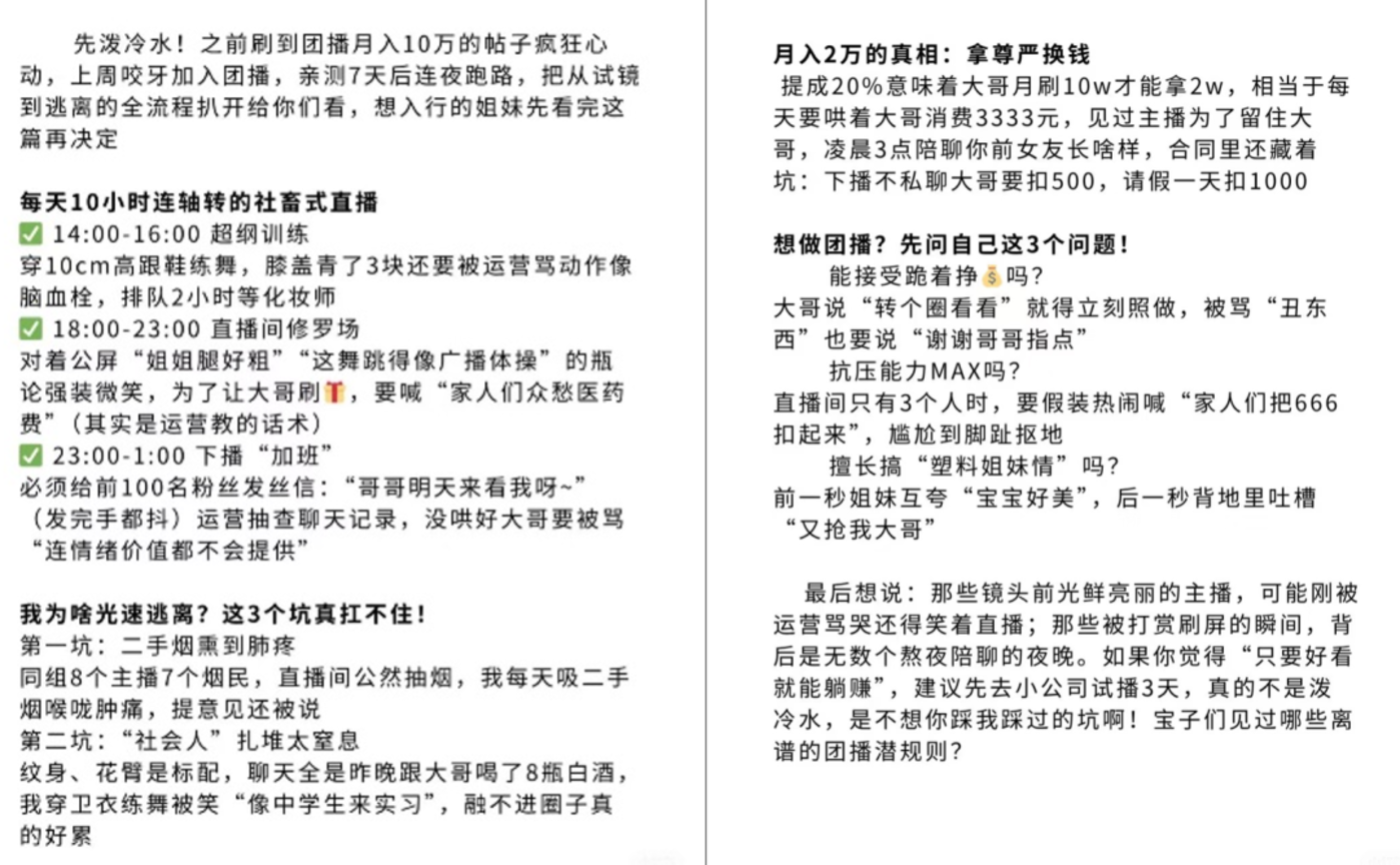 有小红书用户分享自己的团播经历时写道:「下播不私聊大哥要扣 500」。换句话说,团播对主播的身体和精神消耗都非常大。