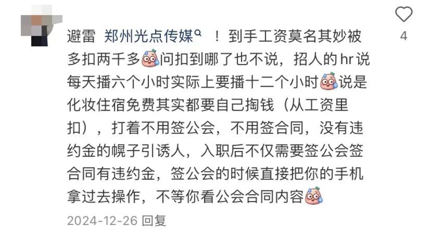 在小红书搜索 「团播面试经历」,各种避雷帖随之映入眼帘。其中一条未按约定发放薪水的避雷帖下,有 300 多人回复,不少都在分享自己被 「坑」 的经历,包括欠薪、隐藏违约金等,月薪拿不满的不在少数。也有用户综合各种可能遇到的问题,总结十条 「团播入行指南」。可见在高薪之下,乱象更甚。