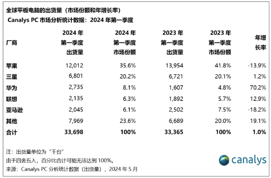 【TechWeb】8 月 11 日消息,分析机构 Canalys 发布数据显示,2024 年第二季度,全球平板电脑出货量同比增长 18%,达到 3590 万台。其中苹果、三星、华为、联想、小米分居全球平板电脑出货量/市场份额前五。
